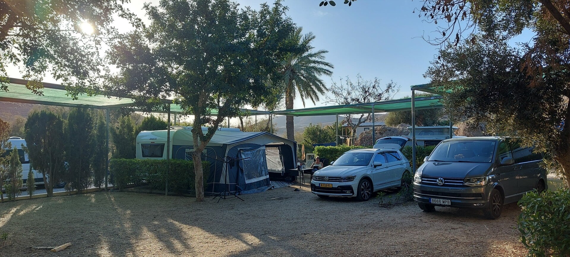🚗 Was eerst de vraag doen we het nog ,maar nu zijn we blij dat we het gedaan hebben .Uitzicht op de bergen ,veel ruimte en iets minder lawaai .Alles staat weer op zijn plek ,voortent weer overeind dus goed dat we het gedaan hebben .