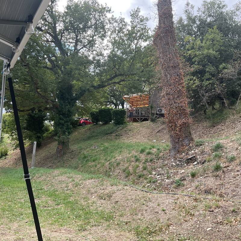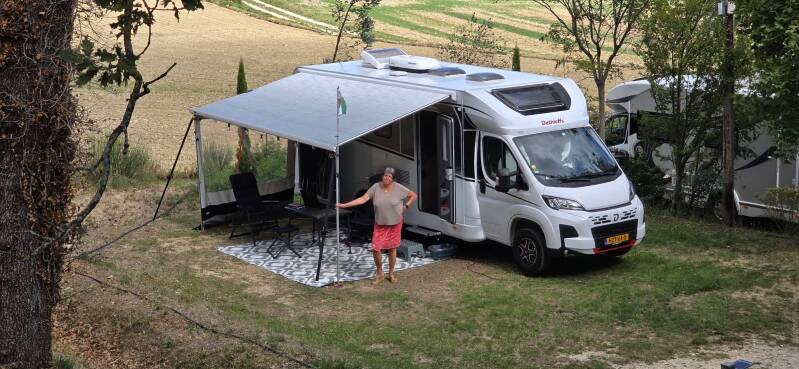 Bas nu bezig met de luifel en een flap ,morgen zien we wel of dit voldoende is.We hebben hier een mooi plekje en zitten in de buurt van de wasgelegenheid en toilet .Lekker rustig .