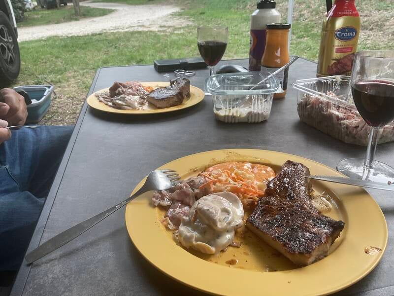 Het is een hele stille camping met een zwembad en een restaurant met grandioos uitzicht .Vandaag lekker opde skottelbraai vlees gebakken.